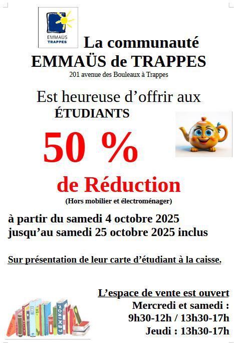Emmaüs Trappes leur offre une réduction de 50% sur leurs achats (hors mobilier et électroménager) sur présentation en caisse de leur carte d'étudiant et ça, du premier samedi d'octobre au dernier samedi d'octobre. De quoi démarrer l'année universitaire en beauté !